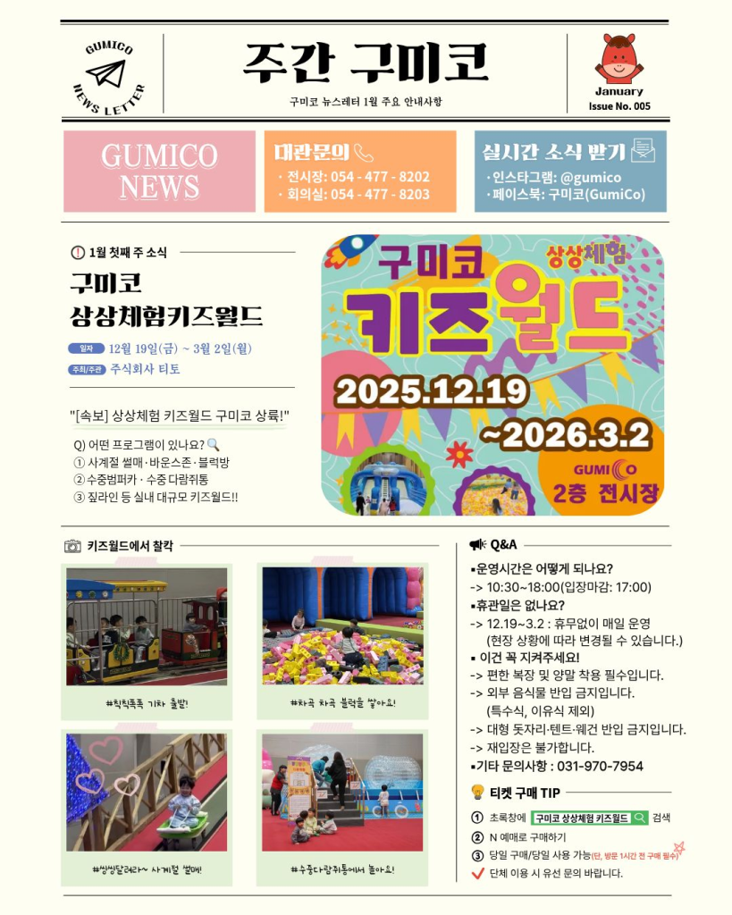 구미컨벤션센터, **구미코**가 전시장 용도변경 이후 처음 선보이는 가족형 체험 콘텐츠 **‘구미 상상체험 키즈월드’**가 문을 열었다. 전시·행사 중심이던 공간이 아이와 가족을 위한 체험형 놀이터로 바뀌었다는 점에서, 이번 변화는 단순한 이벤트 그 이상으로 보인다.